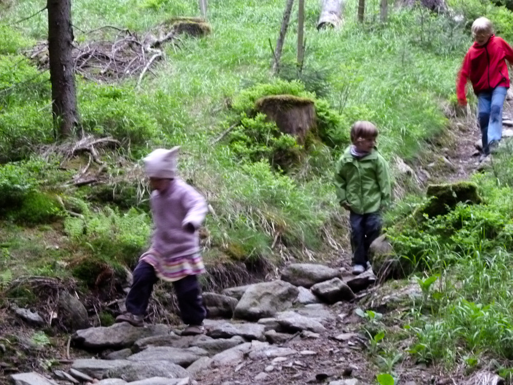 Všechny děti motivované velkou bandou a vynalézavostí tatínků, kteří nechtěli nosit, ušly ohromnou trasu s převýšením jako hrom celou a bez řečí. Bylo to cca 20km, což je na tří až šestiletý prcky v horách docela výkon.